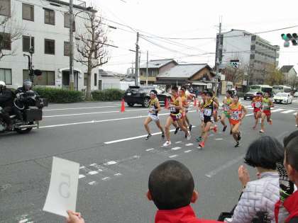 全国高校駅伝男子が1区中間点の北野中学前を通過しました。先頭集団の中で洛南高校もがんばっています。