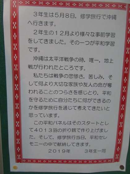 この思いを平和セレモニーで伝えてほしいと思います。その平和セレモニーで献納する千羽鶴が出来上がりましたので紹介しておきます。皆さんご苦労様でした!