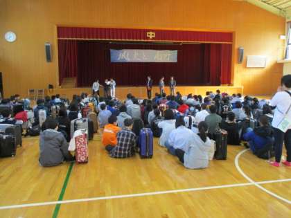 3年生は今日から,待ちに待った修学旅行です。朝7:30と少し早い集合でしたが,出席生徒は全員遅れず登校してきました。体育館で生徒司会進行の出発式。添乗員さんと写真屋さんに挨拶した後,先生のお話を聞きました。予定より少し早い出発でしたが,伊丹空港目指して無事出発しました。沖縄のお天気も何とか持ちそうな予報です。たくさんのことを勉強して,たくさんの思い出を作ってきてください。HPは随時更新していきます。