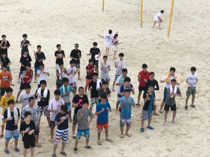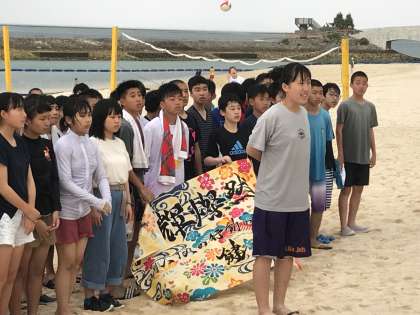 マリン体験・文化体験が無事終了しました。お礼のあいさつをした後,みんなでダンスを踊ったのですが,踊り終わった途端に大雨!慌ててホテルに避難しました。活動中に降らなかったのは日頃の行いがいい証拠ですね。