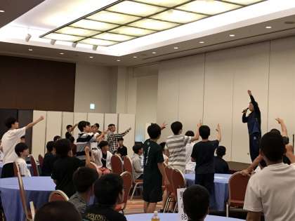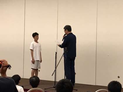 校長先生と大じゃんけん大会。この後,還暦を迎えられた校長先生に「ハッピーバースデー」の大合唱が送られました。