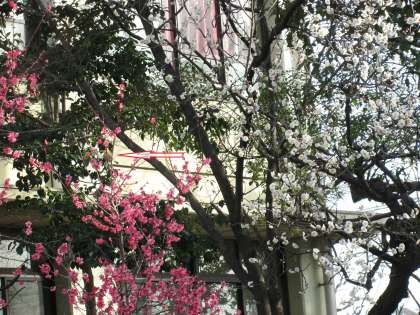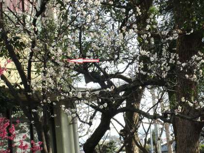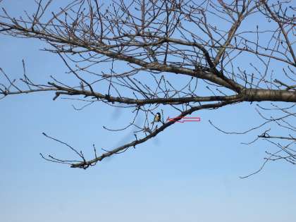 2月7日、校内にはいろいろな野鳥が飛来します。梅に取り付いているのはメジロです。今日は4羽で飛来しました。分かりますか?