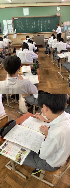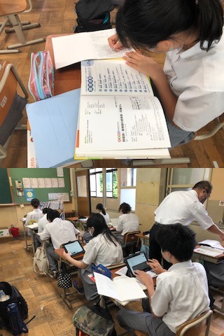 2年生の国語の授業です。図書館の本やタブレットを活用し,自分の調べたい職業の情報を集めます。そして,紙面構成を工夫しながらその仕事について自分の考えをまとめていきます。事前に中央図書館で本を借りてきたり,家で下調べをしていた人もいました。毎回,意欲的に取り組んでいます。学校司書からも参考資料の書き方や本の奥付についてアドバイスをもらいながら仕上げていました。