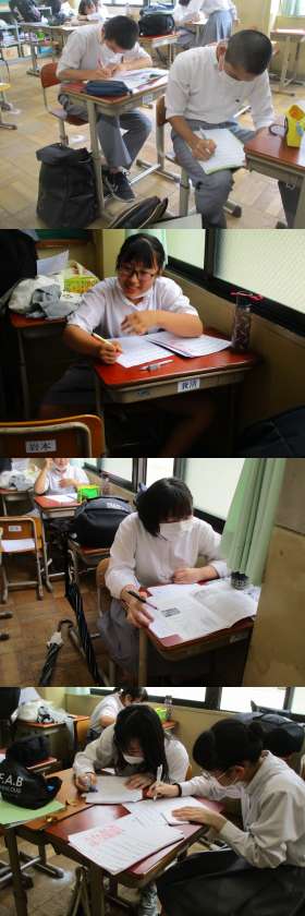 本日,学習質問日の最終日でした。今日も1年生は,多くの生徒が残って学習していました。2,3年生は,少数でしたが理解しようと必死に取り組んでいました。いよいよ明日からテストが始まります。明日にテストがある3教科(国語,英語,社会)の学習をしっかりやりましょう。ただし,寝不足はダメです。勉強する時間を決め,明日に備えましょう。