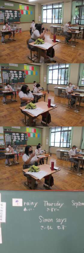 英語で言われたことに対し,ジェスチャーで返していました。みんな,しっかりと聞きとることができていました。この調子で頑張ってください。
