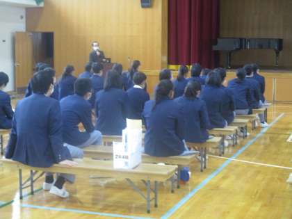 本日6限目に2年生が体育館において,進路学活を行いました。進路主事より中学校卒業後の進路について話がありました。まだまだ先の話だと思っている人も多いかと思いますが,あっという間にその時が来ます。手遅れにならないように今から準備をしてほしいと思います。先ずは,卒業後の進路のことを知ること,そして,どのような選択をしても対応できるように勉強をすることです。
