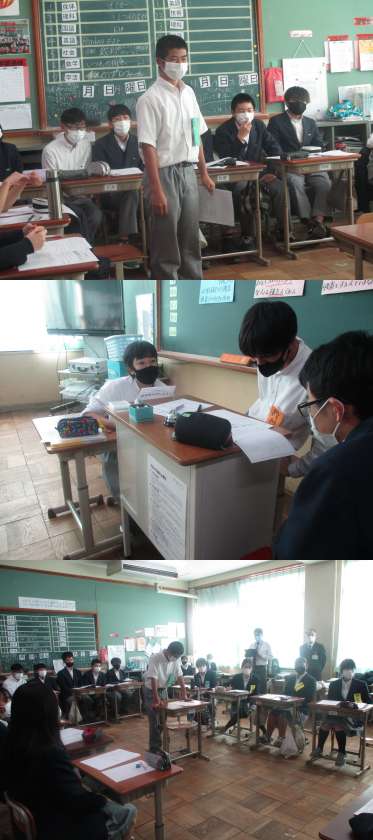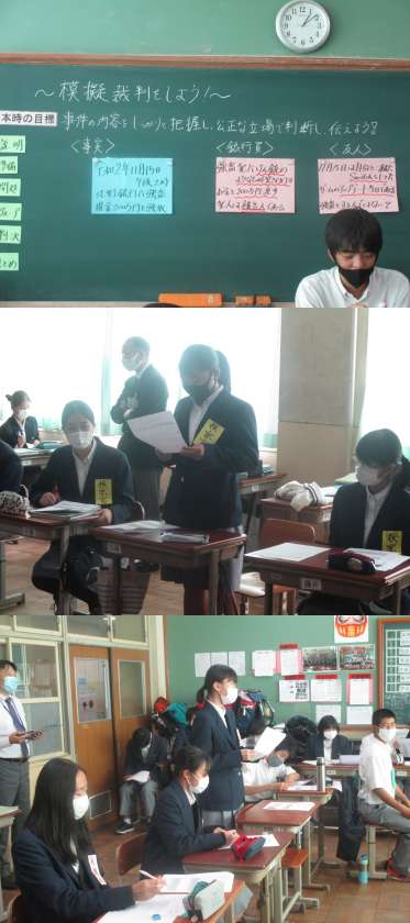 本日,5限目に研究授業が行われました。内容は,「模擬裁判をしよう」でした。裁判長・裁判官,検察官,弁護人に分かれて,事件の内容をしっかりと把握して,公正な立場で判断することが出来るかを目標に授業が行われました。それぞれの,役になりきり,有罪を確定するため,無罪を確定するため,そして,判決を下すためにいろいろと意見をぶつけ合いながら,そして公正な立場で話を聞いていました。今回の模擬裁判では被告人が有罪になり閉廷しました。なかなか自分の意見を相手に伝えることや,反論することが難しかったようです。今日の授業から学ぶべきことは,たくさんあったのではないでしょうか。