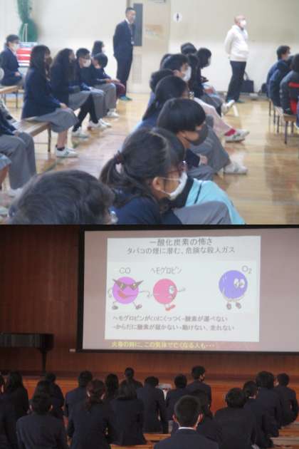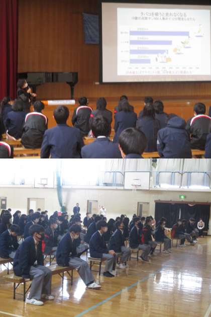 本日4限に体育館において,防煙教室が行われました。喫煙は法律で20歳以上と決まっています。今回は法律の話ではなく,たばこの害について学びました。喫煙したときの害だけではなく,周りの人にも害を及ぼす受動喫煙のことも学びました。今日の話を理解し,これから先,しっかり行動できるようにしてください。