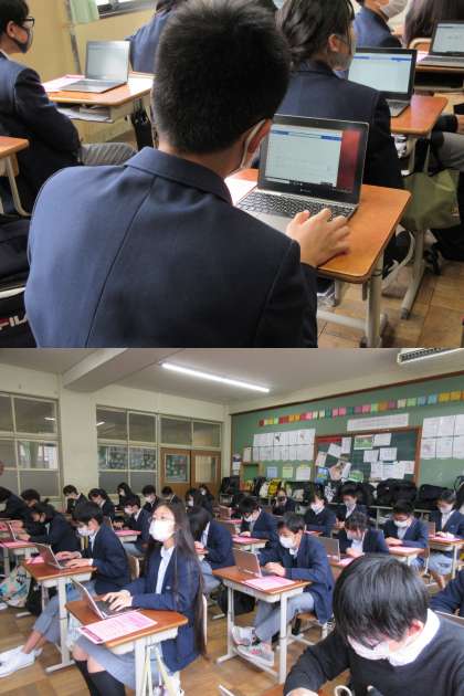 2年生でGIGAスクール構想で導入されたタブレット端末を利用して授業を行いました。今日は,導入部分の情報モラルの話からログインの仕方,そしてMicrosoft365にサインインをして,Wordを使って簡単な文書作成まで行いました。2年生は,修学旅行の平和学習にタブレットを利用しする予定になっています。全員,無事にログインをすることができました。慣れるまで時間がかかるかもしれませんが,興味を持って,学習をしていきましょう。