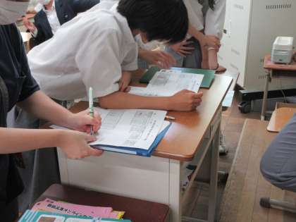 本日,全学年で体育の部の色別エントリーがありました。今年度は,3年生は4クラスですので,そのまま4色に分かれ,1,2年生は3クラスですので,各学年で4色に分かれました。それぞれの学年でエントリーする種目を決め,今年度から新しい種目も加わり,例年とは異なる体育の部になりそうで,楽しみです。