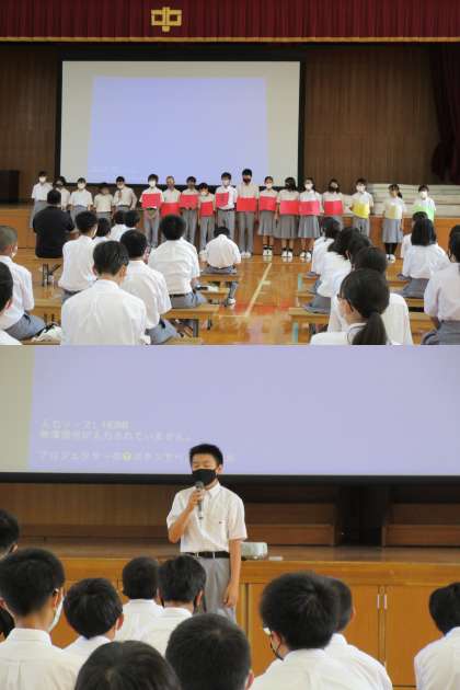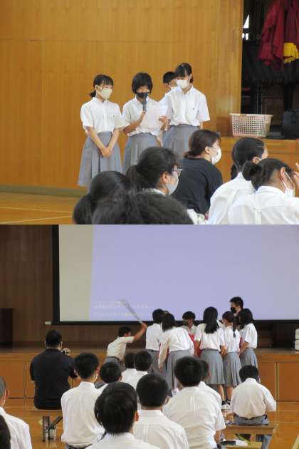 本日,学年集会が行われ,1学期のまとめをしました。各クラスから,工夫しながらの発表があり,クラスの反省を言ったり,寸劇で発表しているクラスもありました。ほのぼのとした雰囲気で1学期の反省が行われ,最後に学年のまとめを発表してくれて,2学期に行われる学校行事に向けて頑張りましょうと締めくくりました。