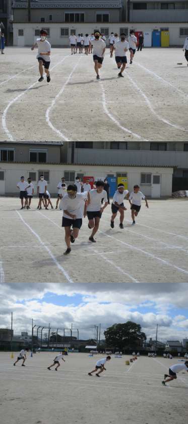 いよいよ,午後から3年生の部が始まりました。中学校生活最後の体育大会,競技は少なくなってしまいましたが,全力を出し切りましょう。100m走の様子です。