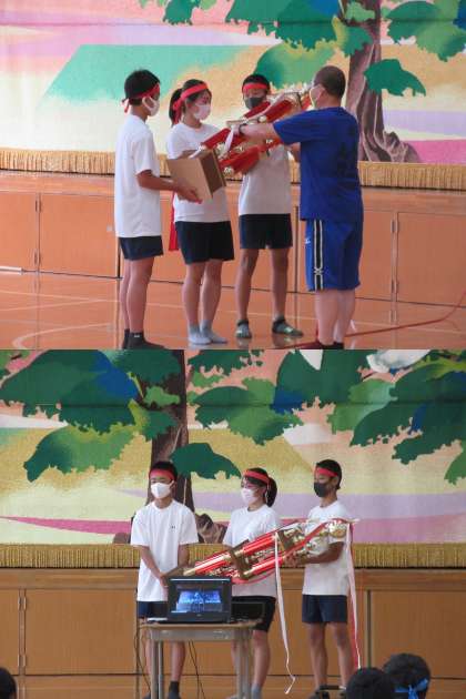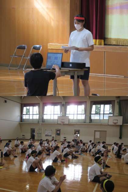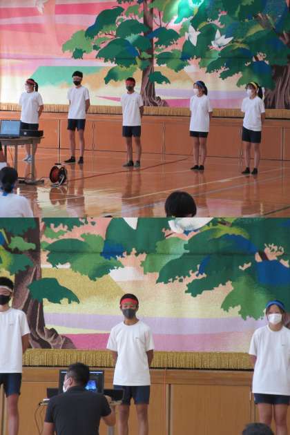 学年別で1日にわたり行われた体育の部の競技が終わり,3年生は,体育館に入り,1・2年生は各教室において生配信で行われました。1日中,暑かったですが,無事終了しました。9月に行われる予定でしたが,緊急事態宣言が出ていたので延期し,今日になりました。全体から学年別になり,種目も変更になって,制限された中での体育の部でしたが,一生懸命取り組んでいました。