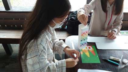 大雨となりましたが、大自然のなか普段味わえない貴重な体験を満喫していました。和紙でつくるランプシェードもオシャレな作品に仕上がっていました。