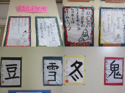授業で取り組んだ作品を廊下に展示しました。どの作品も丁寧に仕上げてあり,力作です。これからも素敵な作品をどんどんつくってください。