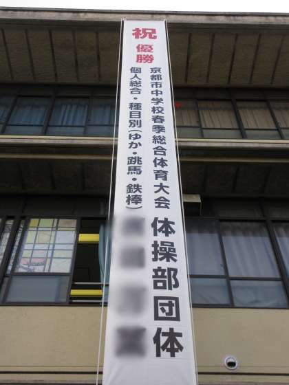 遅くなりましたが,体操部が春季大会で団体と個人で優勝しましたので,垂れ幕を作成し設置をしました。これで3本目になり,立派な垂れ幕が完成しました。