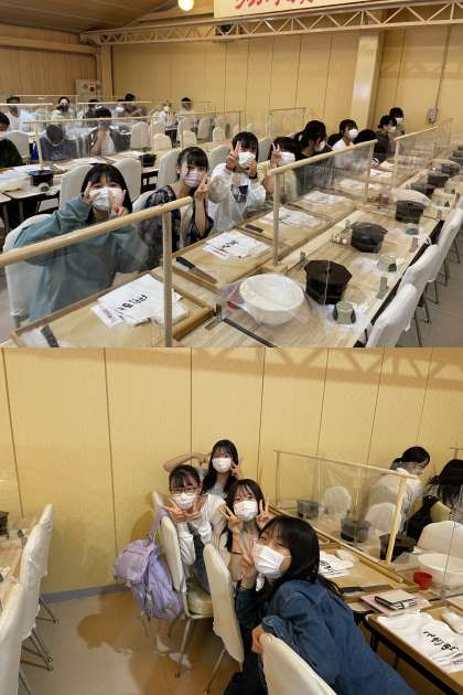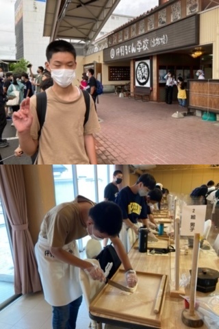 先程、中野うどん学校に到着して、うどん作りを始めます。麺を伸ばして切ったり、音楽にのって、粉をこねたりそれを応援したりするみたいです。切った麺を昼食時に食べるみたいです。どんなおうどんになるのか楽しみです。