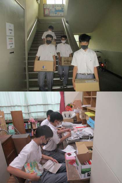また、事業所がお休みのところは、学校に登校して奉仕活動をしてもらいます。本日は、体育館の長椅子の点検と図書館の廃棄本の移動をしてもらいました。