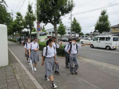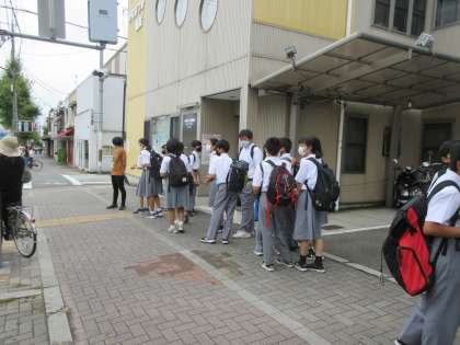 本日、1年生は校外学習に出かけました。午前中に企業訪問をします。事前に考えた質問をします。その後、チェックポイントで昼食をとり、午後からは」京都の文化財を訪れます。