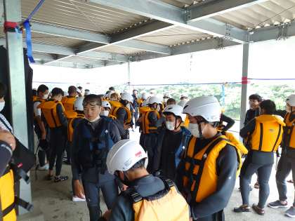 吉野川ラフティング会場に無事着きました。この後、ウエットスーツに着替えてスタートポイントに移動します。いよいよラフティング開始です!!