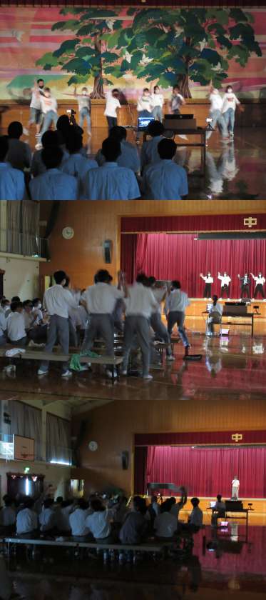 学年や1組の発表の間に有志による発表が行われました。オーディションを経て、歌、ダンス、劇等、自分の特技を披露してくれました。どの組も堂々としていて、体育館にいた3年生も一緒に踊ったり、声援を送ったりしていました。また、最後は4人の先生のパフォーマンスがあり、なんと『アンコール』の声まで上がり、大盛りあがりでした。
