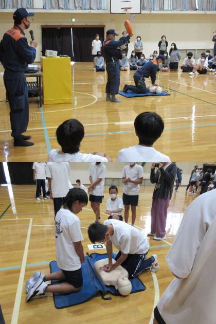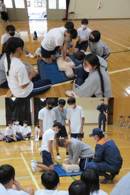 本日、2年生は体育館で中京消防署に来ていただいて、救命講習を受けました。