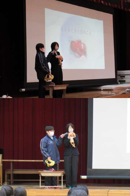 本日、3年生は、5.6限に体育館で性教育学習を行いました。民医連中央病院の助産師の方に来ていただき、講演をしていただきました。