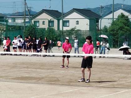 4月28日、女子ソフトテニス部が団体戦に挑みました。前日には個人戦(6位の結果で5月4日も白熱の試合)にも挑んでおり、試合への熱量が充実していました。敗退という結果ではありましたが、エネルギー溢れるプレーから日頃の真剣な練習が想像でき、これからの成長が十分に期待できる試合でした。