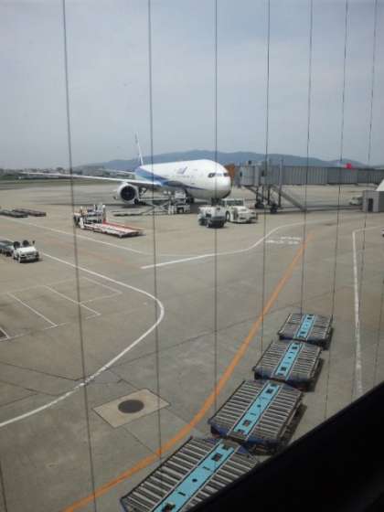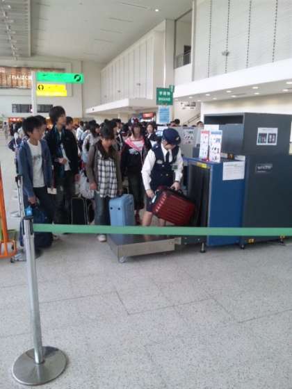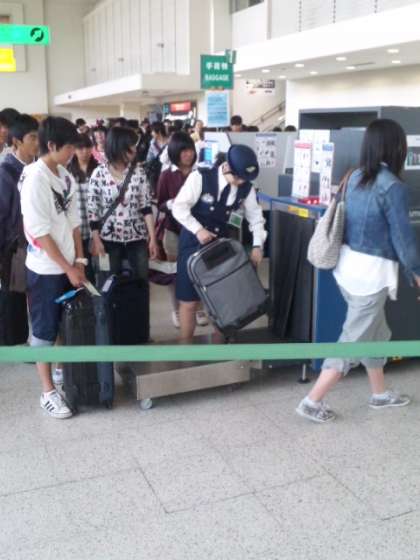搭乗手続き中。荷物はコンパクトな方がいいですよ。機内のバケットに入るサイズだと、手荷物を受け取る時間の省略になります。