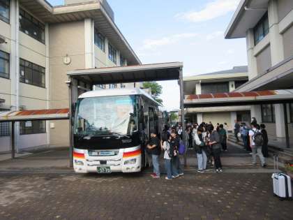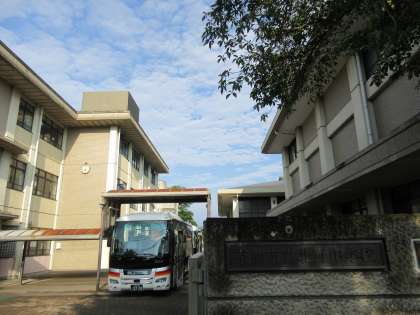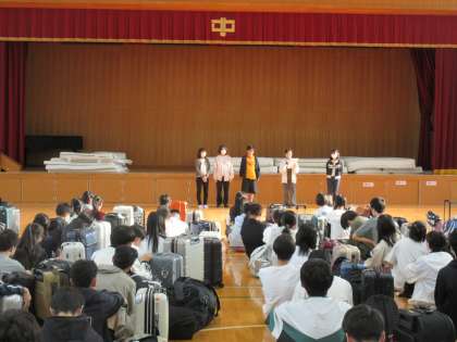 おはようございます。先ほど、3年生が修学旅行へ出発しました。体育館での結団式では、修学旅行実行委員会の皆さんから「目標をもって充実した修学旅行を」とメッセージが発信されました。