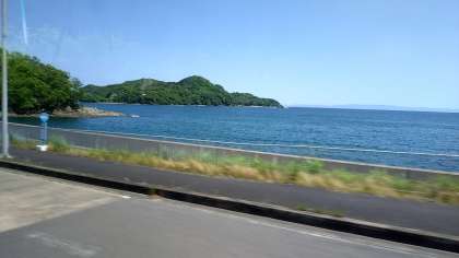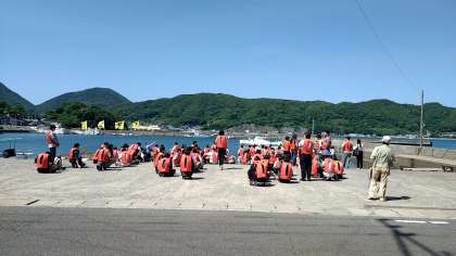 牧島ペーロン体験会場に到着しました。快晴のなか、今からペーロン体験が始まります。ドラの音に合わせ、櫂を使って漕いでいきます。練習の後、クラス対抗戦が行われます。