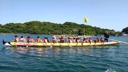 ペーロン体験を終え、バスはホテルi+Land長崎へと向かっています。車内(2号車)では、翼をくださいの大合唱や謎かけで盛り上がっています。