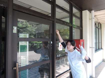今日は、玄関・ピロティの窓ふき等をしました。