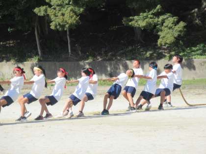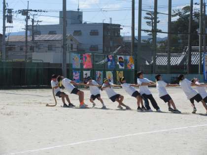 ここからは、学年種目です。まずは1年生の綱引きが始まりました。綱を引く体制を工夫して、力を合わせて引き合っています。
