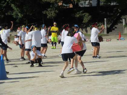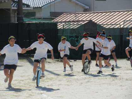 学年種目の最後は、やはり3年生です。「アラカルト全員リレー」と題して、クラス対抗で様々な形態でリレーをしました。騎馬で走ったり、一輪車で走ったり、竹馬で走ったり・・・色とりどりの走り方に、大変魅了されました。また、クラスごとの結束力は、さすが最高学年といった強さでした。