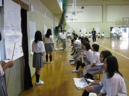 各生徒が制作した発表用紙(模造紙)をローテーションしながら、聞いていく形式です。