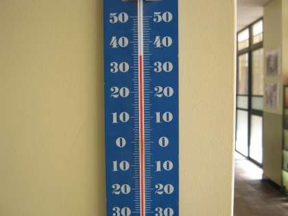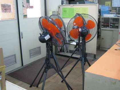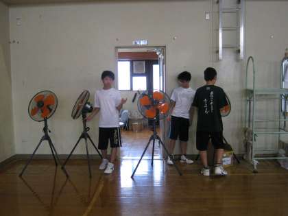 職員室前の温度計は35度です。そんな日にPTAからの寄贈で大型扇風機が4台体育館に設置されました。保護者の方の期待に応えるべく、がんばれ生徒諸君。