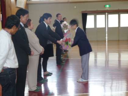 この日付けで退職、または転任する教職員が、北野中学校での最後のメッセージを生徒に伝え、生徒会からはお礼の花束が贈呈されました。