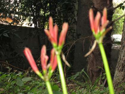 彼岸花…道端などに群生し、9月中旬に赤い花をつけるが、稀に白いものもある。その姿は独特で、夏の終わりから秋の初めにかけて、高さ30 - 50cmの枝も葉も節もない花茎が地上に突出し、その先端に包に包まれた花序が一つだけ付く。曼珠沙華(マンジュシャゲ、またはマンジュシャカ)とも呼ばれる。