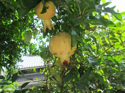 ザクロ…初夏に鮮紅色の花をつける。花は子房下位で、蕚と花弁は6枚、雄蕊は多数ある。果実は花托の発達したもので、球状を呈し、秋に熟すと赤く硬い外皮が不規則に裂け、赤く透明な多汁性の果肉(仮種皮)の粒が無数に現れる。果肉一粒ずつの中心に種子が存在する