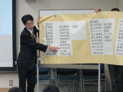12月4日3限・4限、3年生2クラス合同で「租税教室」が実施されました。「わたしたちの生活と税」について講義を受けました。「租税」といわれるものは分類の方法にも依りますが、国税・府税・市町村民税等で約50種類あるそうです。国の財政を家計に例えると、月収40万円(46.1兆円)の家計(税収入+税外収入)とすると支出合計78万円(90.3兆円)借金38万円(44.2兆円)、ローン残高7382万円(709兆円)です。このローン残高(国の借金)が将来に重くのしかかっています。1人当たり1日卵1個分(60グラム)のゴミを減らすと、1年間で1260億円の節税ができるそうですが、これだけでは563年かかりますが…。「無駄を省き、必要なことにお金をかける」国の財政も家の家計もこうあってほしいものです。