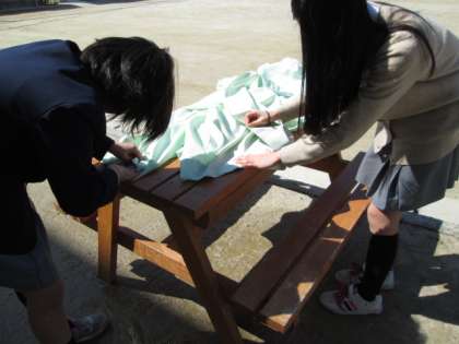 3月22日晴天。カーテン洗浄、修理中。生徒も手伝ってくれました。