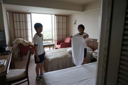 6月6日、2年生チャレンジ体験。「京都国際ホテル」ではベッドメーキング習得中でした。