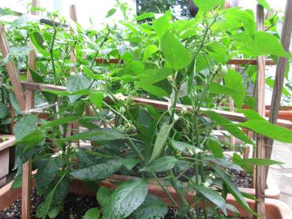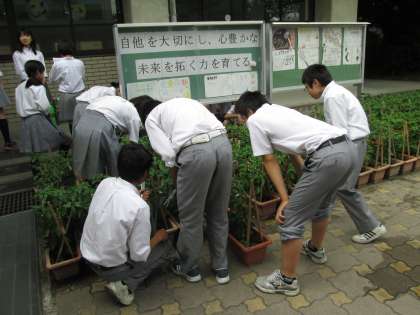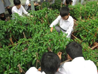 6月12日5限、2年1組は技術の授業中です。『シシトウガラシ』の実も大きいものがちらほら。そろそろ肥料も必要なようです。