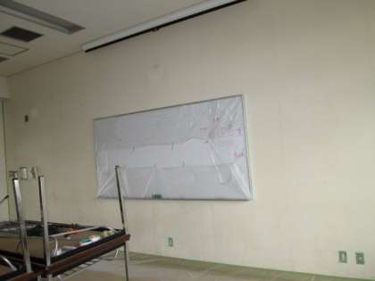 12月6日、2F多目的室がリニューアルします。床の研磨、樹脂加工。クロスの張り替え、そして前面を管理用務員さんに塗装してもらいました。