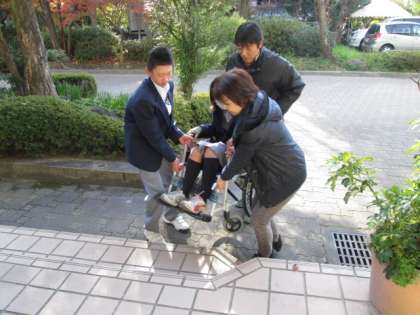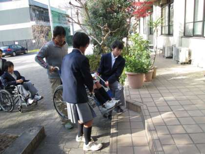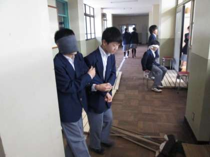 12月9日、1年生は人権学習で『障がい者理解』について学びました。車いすを利用するとき、『段差』があるときの不便さを知り相手の立場に立った介助の方法を体験しました。また、相互にタオルでアイマスクした人を誘導して、介助をする時の方法も学びました。