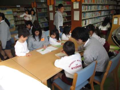12月12日。本日の『幼児との交流学習』は3年1組です。4歳児の子どもに図書室で読み聞かせ中。
