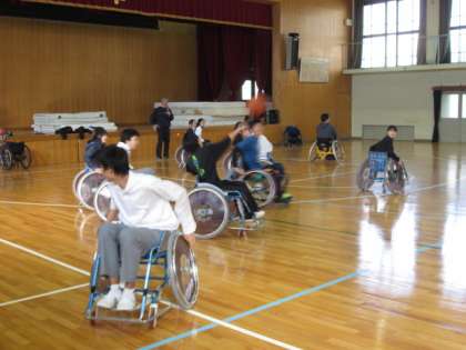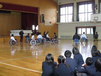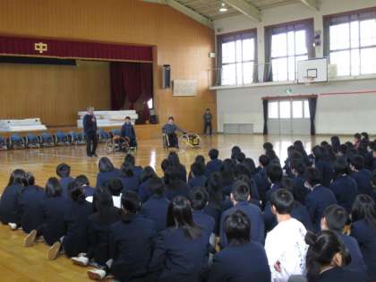 12月2日午後、体育館で人権講演会を行いました。今年度は『車椅子バスケットから学ぶもの』と題して、車椅子バスケットについての講演をしていただきました。講演の後には教員と生徒のミニゲームも行いました。