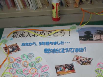 12月5日夜、平成21年度卒業したみなさんへ『母校・恩師からのメッセージ』を制作しています。5年前に卒業したみなさんお元気ですか。成人の日記念式典の時は第2会場の中学校掲示板を楽しみにしていてください。