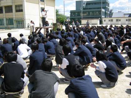 グランドに整列したまま学校長からの講評があり、その後、教室に戻って各クラスでビデオを見て地震による災害から身を守る手段等を学び、よりいっそう防災意識を高めました。
